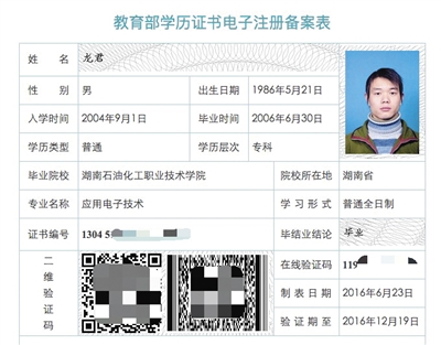 龙君告诉新京报记者,2004年至2006年期间,自己就读于湖南石油化工职业技术学院。期间正常读书、正常毕业。教育部下属相关数据库信息也对此吻合。