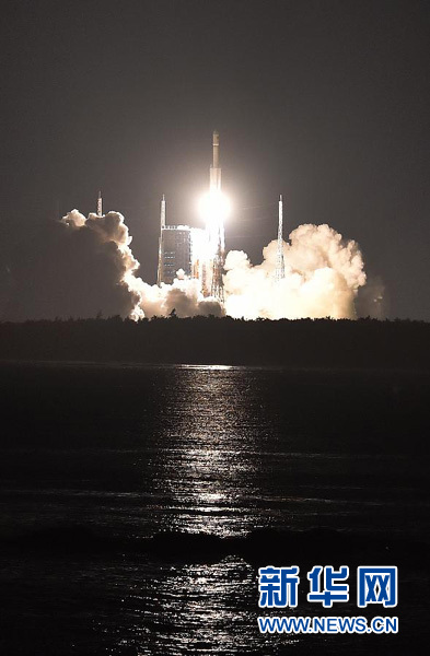 6月25日20时00分,我国新一代运载火箭长征七号在海南文昌航天发射场点火升空,约603秒后,载荷组合体与火箭成功分离,进入近地点200千米、远地点394千米的椭圆轨道,长征七号运载火箭首次发射圆满成功。新华社记者郭程摄