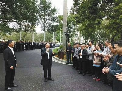 刘小华离开湛江当日,湛江市委机关大院内举办了一场告别仪式。人群中,刘小华拿着话筒,发表讲话。郑科授 摄