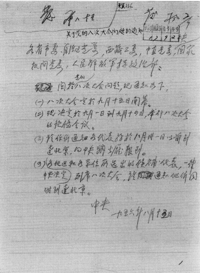 图为1956年8月15日邓小平同志起草的中共中央关于召开党的八大的通知。八大的胜利召开,标志着探索适合我国情况的建设社会主义道路取得初步成果,拉开了全面的大规模社会主义建设的大幕。(陆琴)
