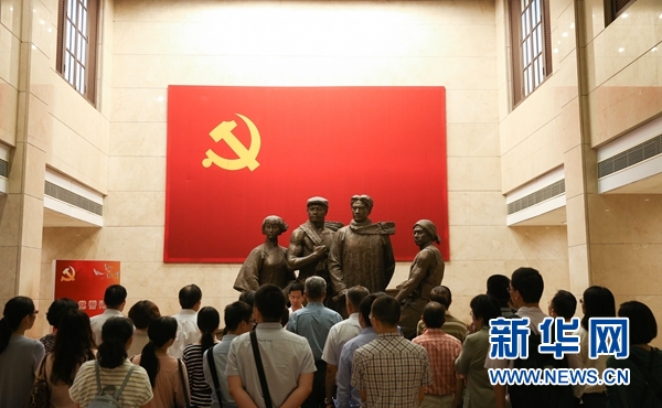 如今,参观者沿楼梯拾级而上,一面火红的党章陈列墙令人眼前一亮。墙上展出了不同时期、不同版本的各种党章。人们在这里驻足良久,仔细观看。