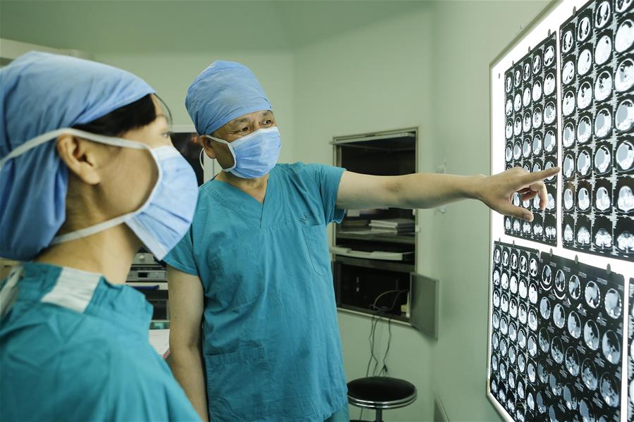 贾立群在手术室与同事讨论病人的病情(2014年7月18日摄)。 “不让一个患儿误诊漏诊”——为了这一梦想,39年来,北京儿童医院超声科主任贾立群坚守一线,以B超诊断精准到位被称为“B超神探”;他始终恪守医生的职业道德,缝死白大褂上的口袋拒绝红包,被称为“缝兜大夫”。新华社记者 张玉薇 摄