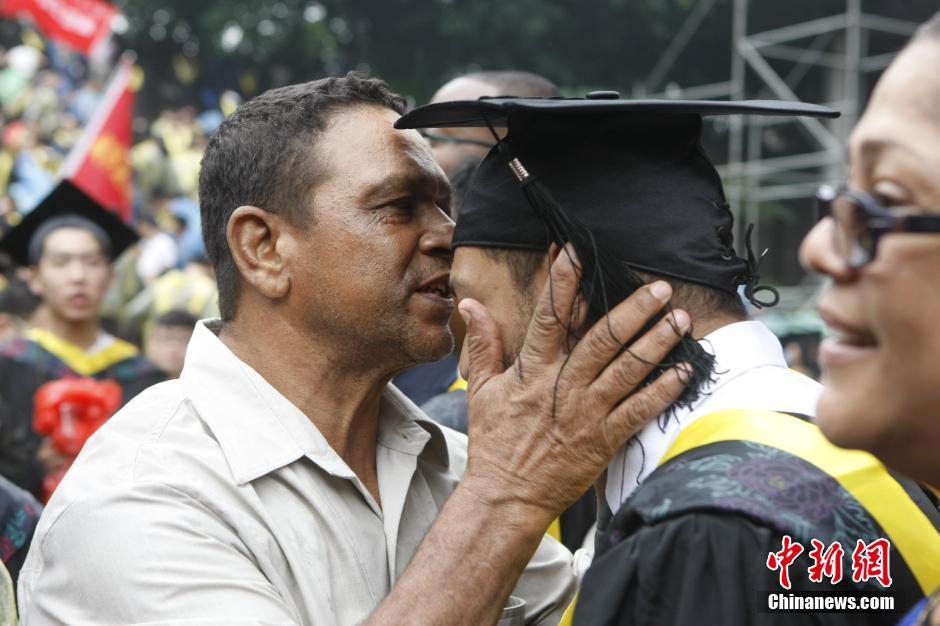 6月28日,近万名重庆大学毕业生在雨中参加毕业典礼。“回顾大学时光,你们用最美的青春做了许多不同的选择,选择了不同的舞台和各自的精彩。”重庆大学校长周绪红在雨中以“选择”为主题,为毕业生上了最后一课。图为重庆大学国际学院学生与家人一起庆祝毕业。 钟欣 摄