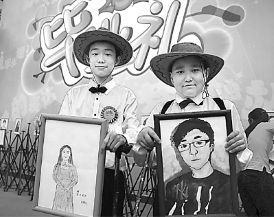 6月28日,北京市中关村第二小学举行2016特色毕业礼,724名六年级毕业生,在父母的陪伴下参加了母校的最后一次聚会。为感恩母校,学生们亲手绘制了自己班主任的画像并进行展览。图为学生与班主任画像的合影。本报记者 郭俊锋摄 光明图片