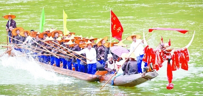 6月28日,农历五月廿四,在贵州省施秉县双井镇平寨苗寨,一年一度的清水江苗族龙舟节拉开帷幕。清水江沿岸苗族村寨的龙舟汇聚于这个苗族龙舟传说的发源地,进行祭水仪式。图为准备比赛的苗族龙舟。奉力摄/光明图片