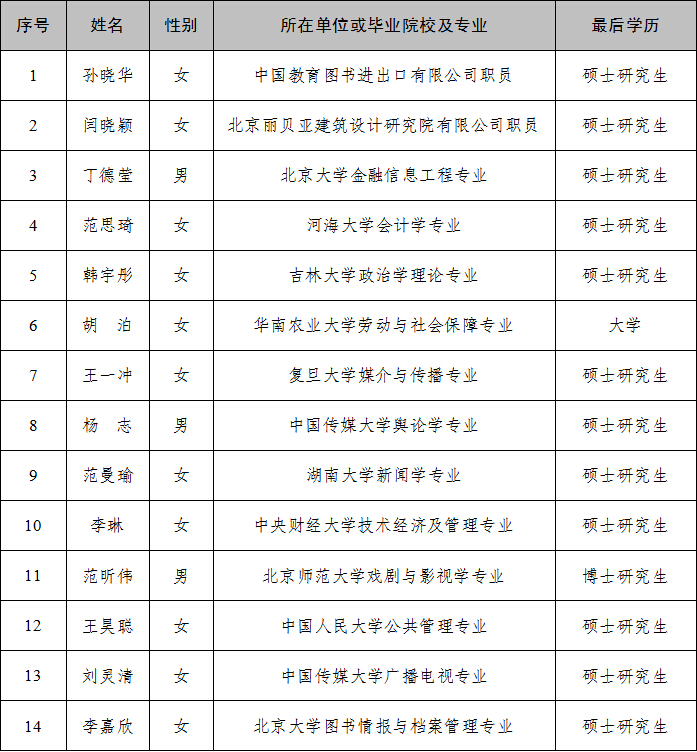 根据《事业单位人事管理条例》和《中央宣传部(国务院新闻办公室)直属事业单位公开招聘工作人员暂行办法》,按照中央宣传部(国务院新闻办公室)直属单位2016年度公开招聘工作人员工作安排,经过笔试、面试、体检、考察等程序,现将拟聘人员名单予以公示: