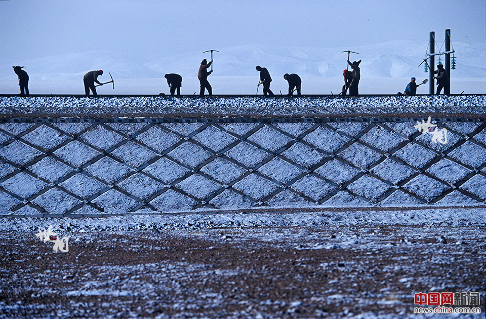 雪中,在路基上作业的工人。