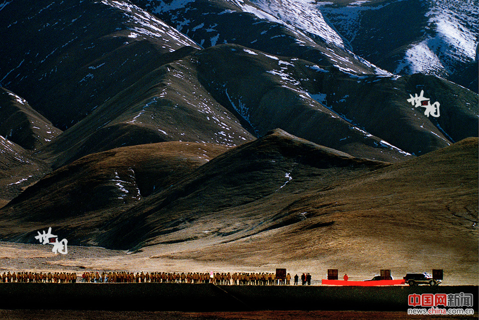 玉珠峰下,一条标语,几块展示牌,站立的人群,空寂无声,却有无声的力量,那些年这样的开工现场在青藏高原多处出现,建设者来到了高原。