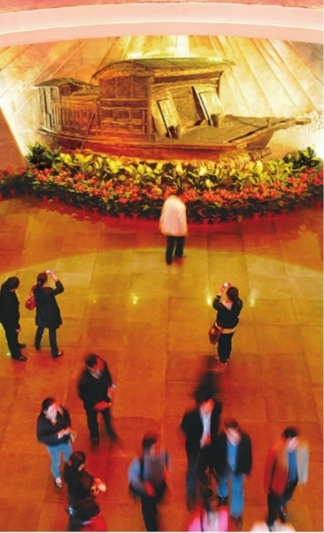 图为人们正在浙江嘉兴南湖革命纪念馆内的“红船”雕塑前参观。新华社发