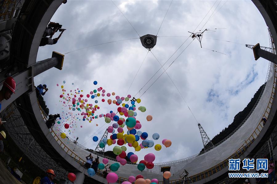 7月3日,工作人员在现场放气球,庆祝世界最大单口径射电望远镜主体工程完成。当日,位于贵州黔南州平塘县大窝凼的世界最大单口径射电望远镜——500米口径球面射电望远镜(FAST)的最后一块反射面单元成功吊装,这标志着FAST主体工程顺利完工。新华社记者 欧东衢 摄