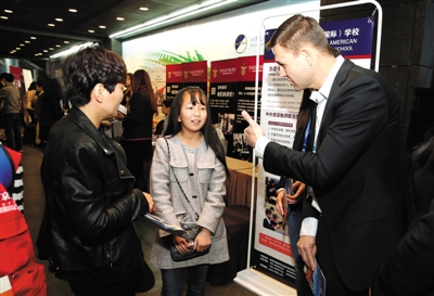 在2016新京报国际学校联展上,考生与外国学校工作人员进行交流。新京报记者 王远征 摄