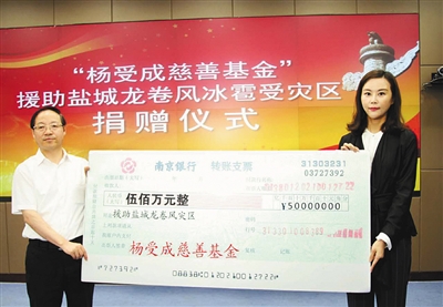 6月23日,江苏省盐城市阜宁县遭遇罕见龙卷风冰雹灾害,造成重大人员伤亡和财产损失。灾情发生后,杨受成响应国家赈灾号召,第一时间通过名下“杨受成慈善基金”捐赠500万元款项,用以缓解受灾群众燃眉之急。