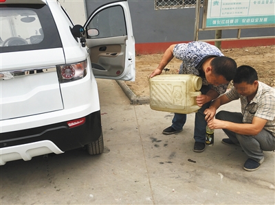 上图代步车生产公司,两名工人正在给一辆将要装车发货的燃油车加油。