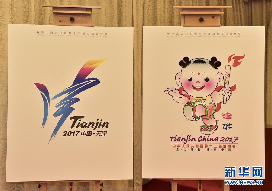 7月3日,第十三届全运会会徽与吉祥物正式亮相。第十三届全运会会徽由书法字“津”、“13”、“张开双臂的人形”和“海河”等元素构成,呈“火炬”造型,取名为“奔向未来”。吉祥物取名为“津娃”,取材于天津杨柳青年画,并与现代卡通形象进行了有机整合,具有浓郁的民族风格和天津特色。第十三届全运会将于2017年9月在天津举行,赛期为13天。这是第十三届全运会会徽(左)与吉祥物“津娃”(7月3日摄)。 新华社记者岳月伟摄