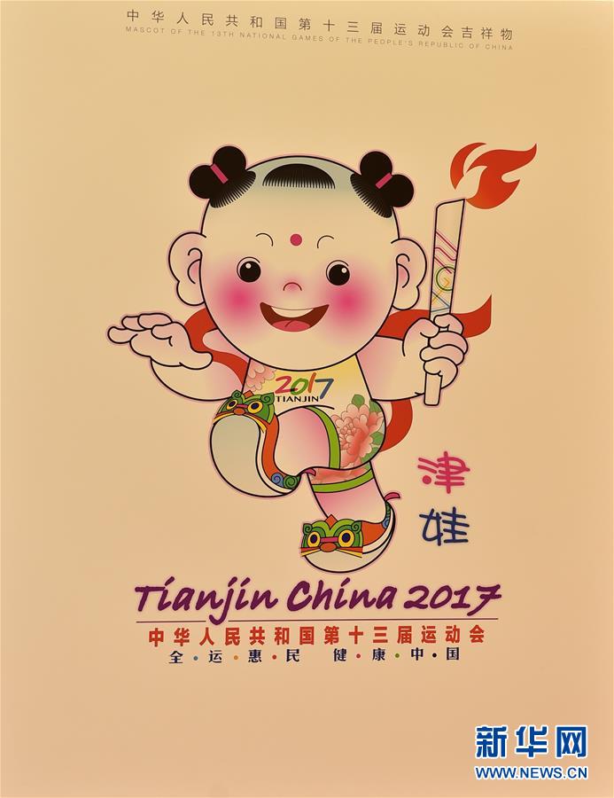7月3日,第十三届全运会会徽与吉祥物正式亮相。第十三届全运会会徽由书法字“津”、“13”、“张开双臂的人形”和“海河”等元素构成,呈“火炬”造型,取名为“奔向未来”。吉祥物取名为“津娃”,取材于天津杨柳青年画,并与现代卡通形象进行了有机整合,具有浓郁的民族风格和天津特色。第十三届全运会将于2017年9月在天津举行,赛期为13天。这是第十三届全运会吉祥物“津娃”(7月3日摄)。 新华社记者岳月伟摄