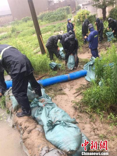 常州市公安局焦溪派出所组建30人的抢险队伍,在居民集中处外围强筑防水堤坝。 唐娟 摄