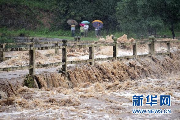 安徽省金寨县吴家店镇一座桥几乎被水淹没。新华社记者 刘军喜摄