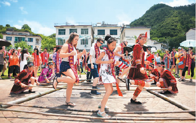 7月4日,来自美国、澳大利亚、法国、捷克、希腊等19个国家的39名海外名校学子,来到浙江省金华市武义县柳城畲族镇十里荷花景区和江下村,与畲族村民互动联欢,并一起赏荷花,参加跳竹竿舞、扇面画画等体验活动。