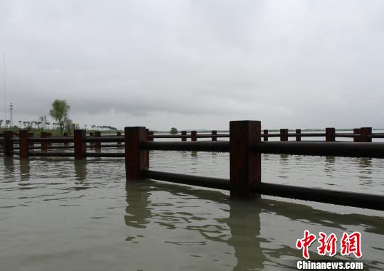 在赤山湖国家湿地公园内,记者看到内湖沿岸汪洋一片,东西两个闸口已经全部打开,外环河水流入内湖,12个亲水平台被逐渐淹没,湖畔树木的树干被淹没大半……