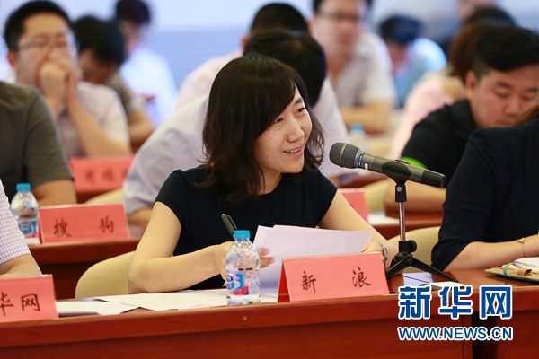 7月6日,国家网信办主办的第二届全国网络诚信宣传日活动在京举行。图为座谈会上,新浪网副总编辑王薇发言。(新华网 尹世杰 摄)