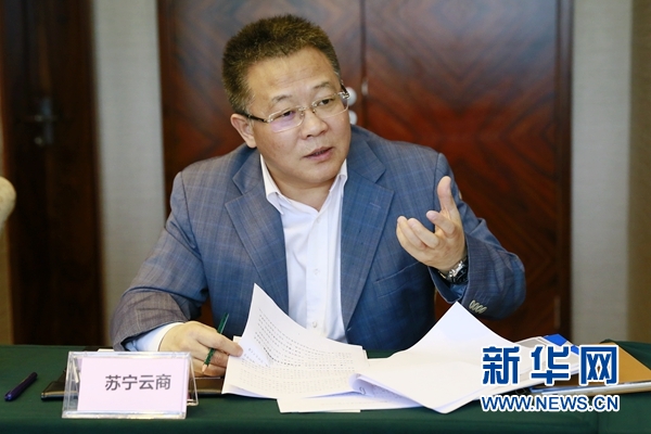 7月6日,国家网信办主办的第二届全国网络诚信宣传日活动在京举行。图为在电子商务领域网络诚信建设分论坛座谈会上,苏宁云商副董事长孙为民发言。(新华网 杨诺 摄)