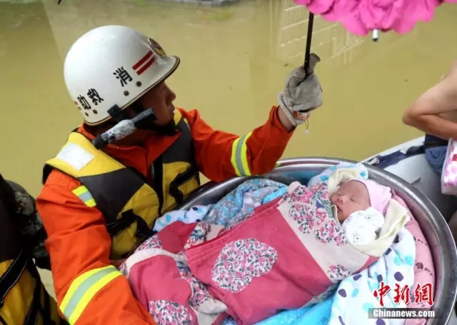 6月21日,贵州沿河县甘溪镇,消防员用一个大水盆装下刚出生10天的婴儿。