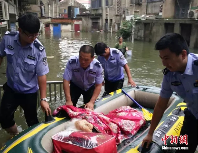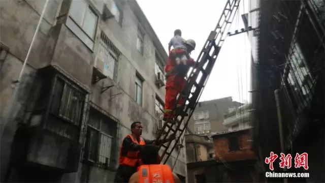7月5日,湖北省汉川市城隍镇一小区内的十余栋房屋被洪水淹没,积水深达1.5米。汉川消防官兵涉水逐户搜救,成功救出被困家中的婴儿。