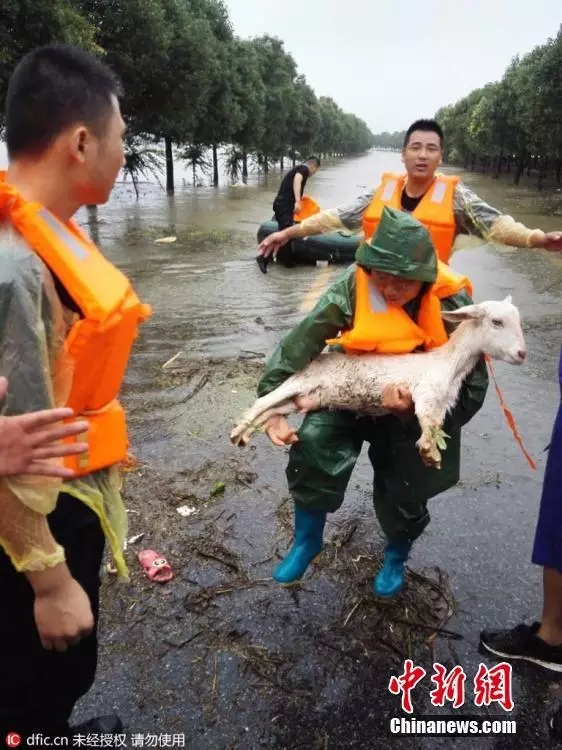 在这些最可爱的人怀抱中的,有时还出现一些小动物。7月3日,安徽省马鞍山市当一农业示范园水情告急。经过2个多小时奋战,民警安全转移受困群众5人。当民警要将两位大妈送上岸时,她们拉住了民警的手,哭着说:“求求你们,我们的全部家当还在水中,没有了它们,我们也活不了。”民警在完成救人任务后,重返现场,帮大妈带回了羊……