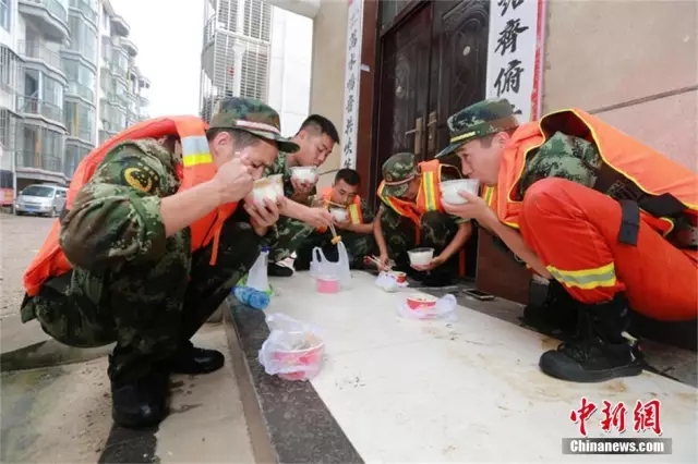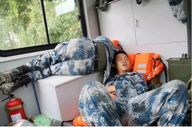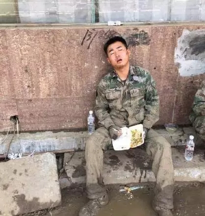 短暂休憩后,这些年轻人的战士们放下手中已经冰冷的盒饭,从岸边沙袋上爬起,把泡肿了的双脚塞回军鞋中。他们又要去一线救援了,因为,还有很多群众等着他们……
