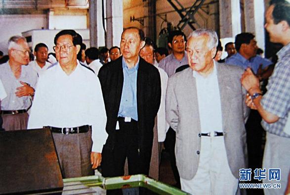 2001年9月,陈锦华同志在大连造船厂考察。 新华社发
