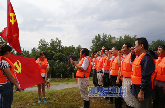 在赶往陈瑶湖镇的江堤上,我们偶遇钱桥镇党员先锋队。他们的巡堤护堤责任段在汤沟镇中心村。30多位党员代表118名先锋队员,面对党旗,庄严宣誓:人在堤在!