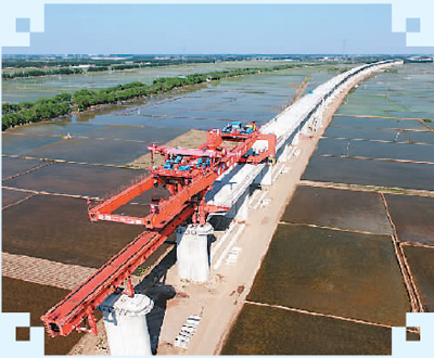 图为巨型架桥机正在架设桥梁。