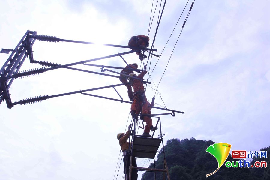 重庆供电段职工对渝怀线核桃园站的受损设备进行抢修。通讯员供图