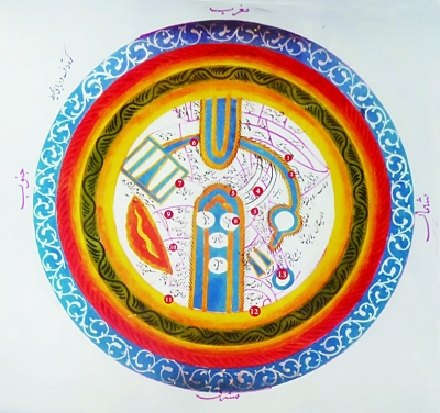 图中地名分别是:1.西方 2.君士坦丁堡 3.阿塞拜疆 4.西拉夫(港) 5.库尔祖姆(埃及古港及红海海域) 6.埃及 7.阿曼海 8.哈尔克岛(伊朗西南部) 9.法尔斯(今伊朗南部)海 10.印度海(洋) 11.中国海 12.中国大陆 13.河中(中亚)。图用波斯文标注。方位是:上西下东,左南右北。此图现收藏于伊朗议会图书馆。