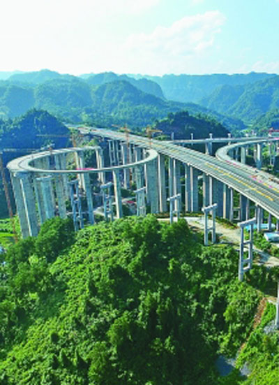 永顺至吉首高速公路(永吉高速)主线全长84.492公里,全线双向四车道,设计时速80千米/小时,预计2016年年底建成通车。由于地质条件极为复杂,永吉高速公路是湖南省内桥隧比最高、施工难度最大的高速公路项目。图为修建中的永吉高速公路。