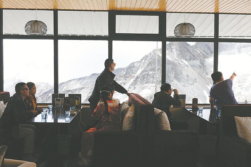 这家咖啡馆于去年6月修建打造,同年10月建成投入使用,所有建筑材料通过缆车索道进行运输。咖啡厅设在冰山之巅索道中心二楼,玻璃窗户视野开阔,雪山景致尽收眼底,不少游客专程慕名前来。(记者 李向雨)