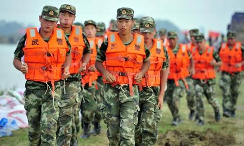 7月9日,武警安徽省马鞍山市支队战士在当涂县姑苏镇准备对大堤进行抢险加固。新华社记者 王雷 摄