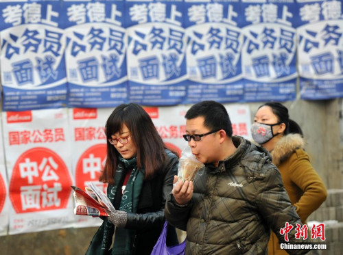 2015年11月29日,在山西太原一处国家公务员考试考点,考生在考前紧张复习。中新社记者 韦亮 摄