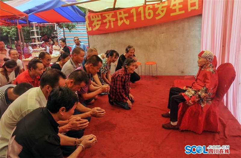 “老人家,祝您寿比南山,福如东海!” “你是王志琼嘛,快坐,快坐!”7月9日,成都都江堰安龙镇何家社区长寿老人罗齐氏迎来116岁生日,七里八乡的500多名亲朋好友和村民纷纷前来向老人贺寿,老人不仅能叫出他熟悉的每个来客的名字,还主动给大家打招呼。