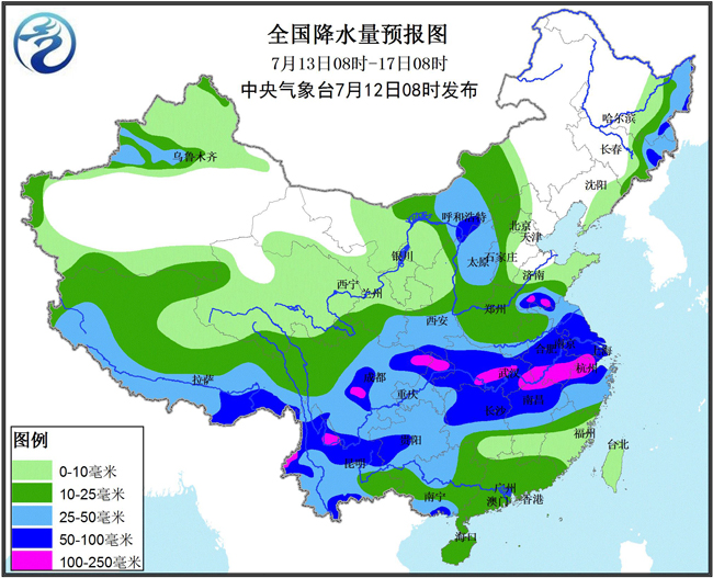 中央气象台预计,7月13日至16日,四川盆地、长江中下游地区将再次出现强降雨过程。期间,四川盆地、江汉、江淮、江南北部等地将有大到暴雨,部分地区有大暴雨,局部伴有短时雷雨大风等强对流天气。预报显示,上述地区的累计雨量普遍有50~90毫米,其中四川盆地东北部和西南部、湖北西部和东部、安徽南部、江西北部、浙江西北部、江苏中部等地的部分地区有100~130毫米,局地有150~200毫米;太湖流域累计降雨量有50~80毫米,局地有100~120毫米。降雨的主要时段在14日至15日,上述地区小时雨强可达20~50毫米,局地可超过70毫米。