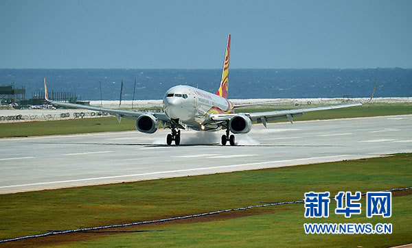 7月13日8时30分、8时40分,中国政府征用的南方航空公司、海南航空公司两架民航客机先后从海口美兰国际机场起飞,经过近2个小时的飞行,分别于10时29分、10时28分在美济礁新建机场和渚碧礁新建机场平稳着陆并于当日下午返回海口,试飞成功。新华社记者 郭程 摄