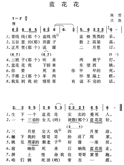 大多数“信天游”的音乐都具有抒情性,而《蓝花花》则因内容的关系,将叙事性与抒情性融为一体,从而大大加强了艺术感染力。特别是著名艺术家郭兰英的演唱,既有奔放清澈的山野味道,又有深沉细腻的叙咏风格,给20世纪五六十年代的听众留下了难忘的印象。这首民歌的记谱法,一种用的是“羽(6)调式”,一种用的是“商(2)调式”,现在通行的是前者,但依“信天游”的普遍风格而言,“商(2)调式”似乎更与原貌相近。