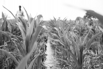 7月11日,山西省永济市城东街道马铺头村村民廉和平正在玉米田进行田间管护。薛启涛摄