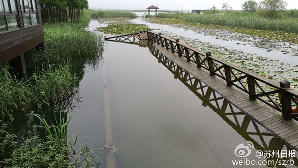 太湖水位上涨,苏州太湖湖滨国家湿地公园部分景点遭淹无法通行,景区关闭。(来源:苏州日报)