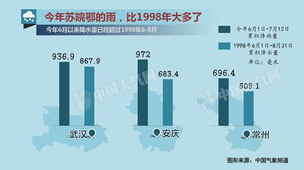 6月以来,江苏、安徽、湖北部分地区的降雨量已超过1998年6-8月的总雨量。