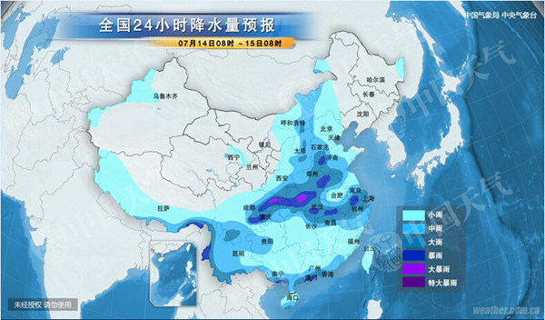 中央气象台预计,14-16日,四川盆地、长江中下游地区将有一次强降雨过程,四川盆地、江汉、江淮、江南北部及黄淮南部等地将有大到暴雨,部分地区有大暴雨,局部伴有短时雷雨大风等强对流天气。其中四川盆地东北部和西南部、湖北西部和东部、安徽南部、江西北部、浙江西北部、江苏中部等地的部分地区有100~130毫米,局地有150~200毫米;太湖流域累计降雨量有50~80毫米,局地有100~120毫米,降雨主要出现在今明天。