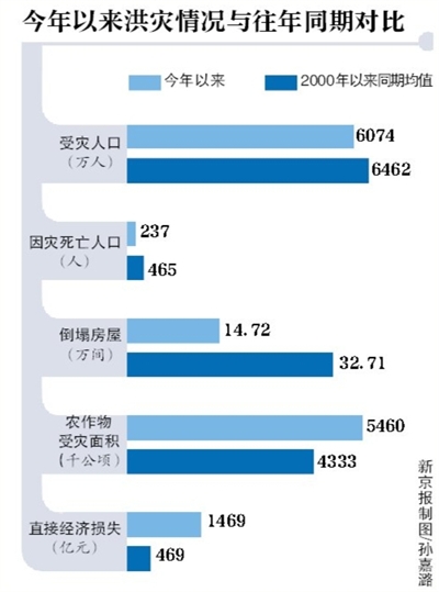 张家团介绍,与2000年以来同期均值相比,受灾人口、死亡人口、倒塌房屋分别偏少6%、49%和55%,受灾面积、直接经济损失偏多26%、213%。