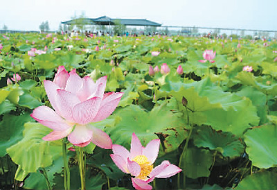 在河南省唐河县桐寨铺镇荷花生态基地,旅游升温惠及当地村民。生态基地由该县福田农业专业合作社投资兴建,已形成集无公害莲藕种植,盆景花莲育种、推广,莲鱼混合养殖为一体的生态链条。
