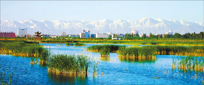 城郊的张掖国家湿地公园,与远处的雪山相映成趣。