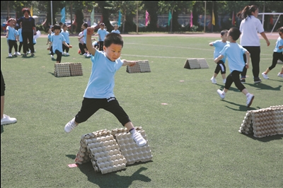 孩子们在用蛋托玩“跨栏”游戏。日前,北京市丰台区嘉园第一幼儿园举办第七届武术节,利用蛋托、纸箱等废旧物品制作的游戏道具,深受孩子们的欢迎。